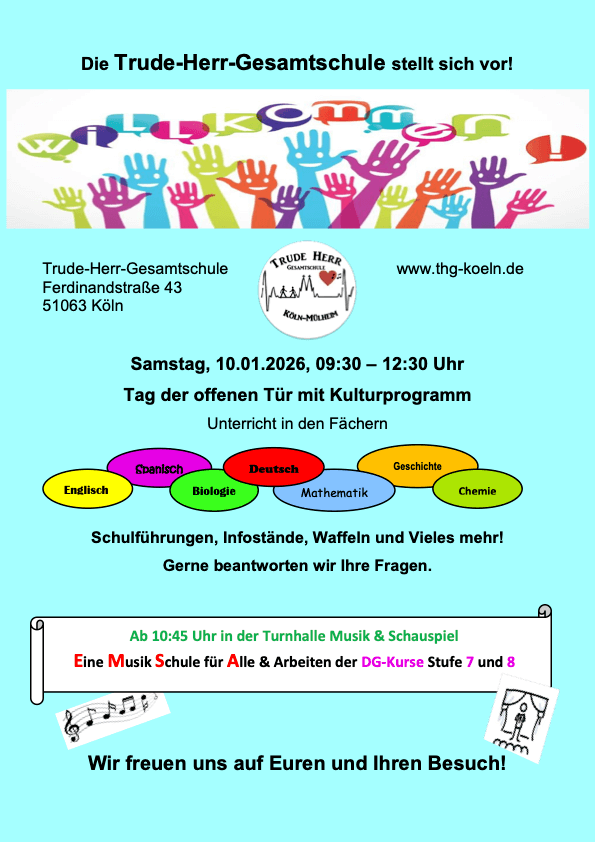 die Trude-Herr-Gesamtschule wird in diesem Jahr wieder einen Tag der offenen Tür gestalten. Dieser findet am 10.01.2026 zwischen 09:30- 12:30 Uhr statt.