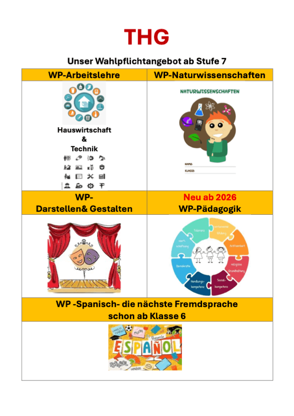 - Zum 7. Schuljahr werden die weiteren WP-Fächer gewählt. Wer bereits Spanisch gewählt hat, wählt kein zusätzliches Fach.