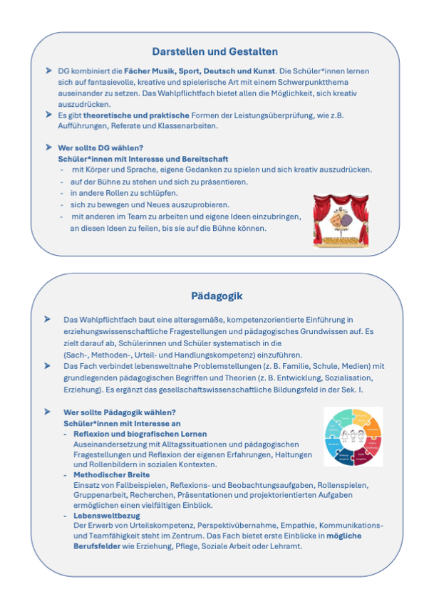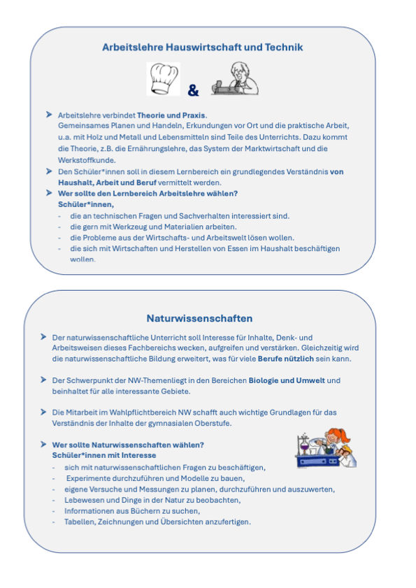 Die SuS durchlaufen Schnupperkurse zu den Fächern. Ein Wechsel des Wahlpflichtfaches nach der Wahl ist in der Regel nicht möglich.
