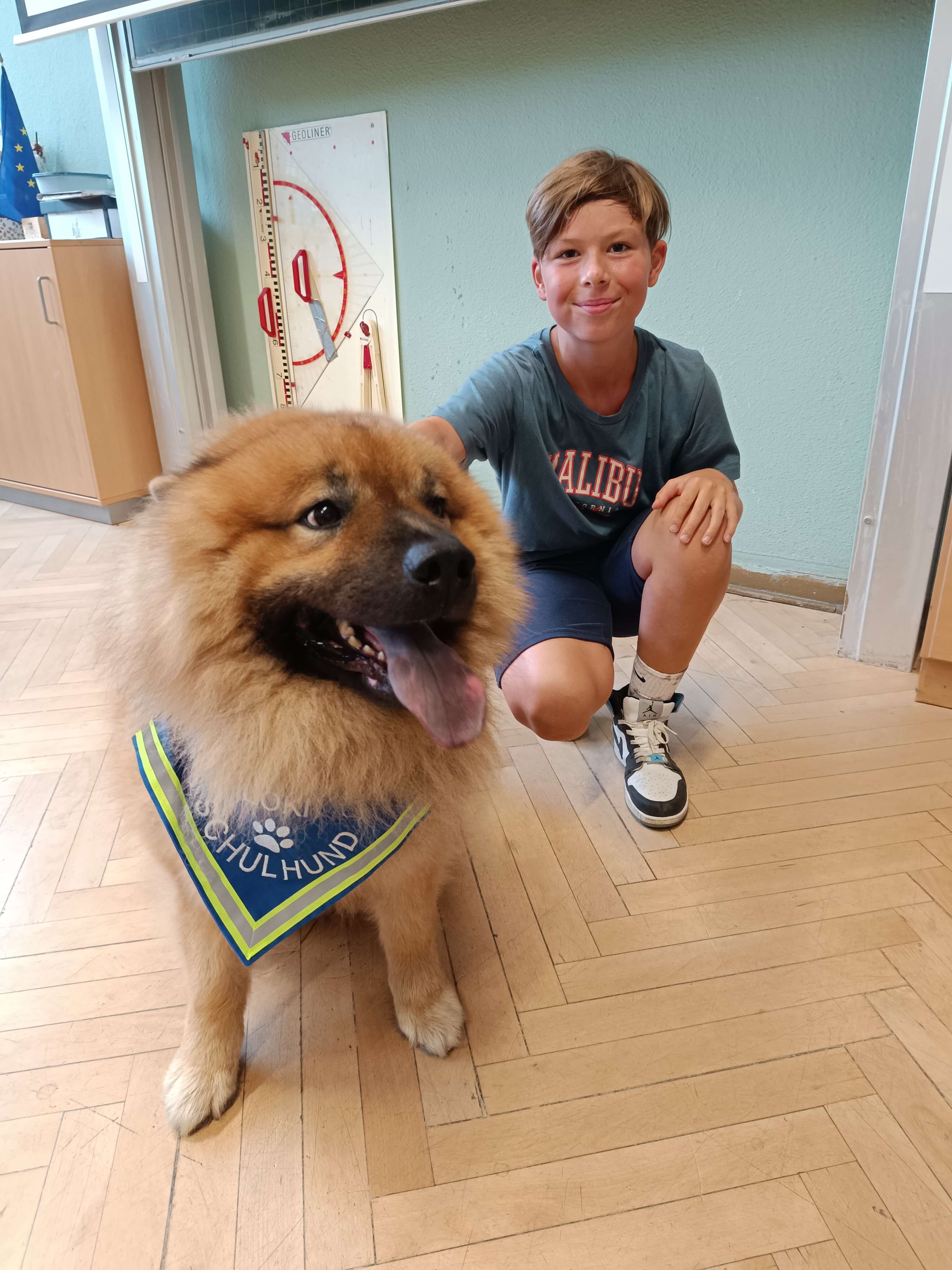 Loki ist ein 5 Jahre alter Rüde und begleitet seine beste Freundin Frau Keil regelmäßig in deren Klasse, die 6b. Dort unterstützt er den Klassenunterricht und tut alles für eine angenehme Lernatmosphäre. Loki ist ein ganz ruhiger und entspannter Typ, offen und zugänglich, er mag Kinder sehr und spielt gerne. Allerdings zeigt er auch ganz klar, wenn es ihm zu laut oder zu wild wird - wie gesagt, er ist eher der ruhige Typ. Und mit seiner ganz besonderen Art und der offiziellen und zertifizierten Ausbildung im „Hundezentrum Kerpen“ nbringt er wirklich alle Voraussetzungen für den Einsatz als Schulhund mit.